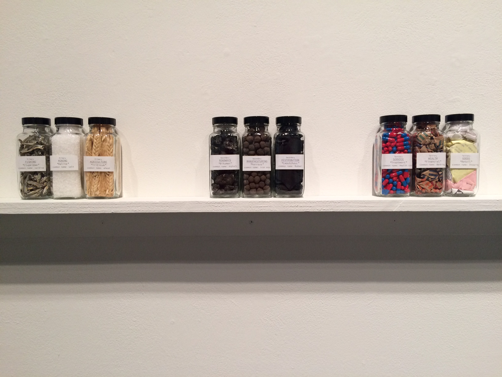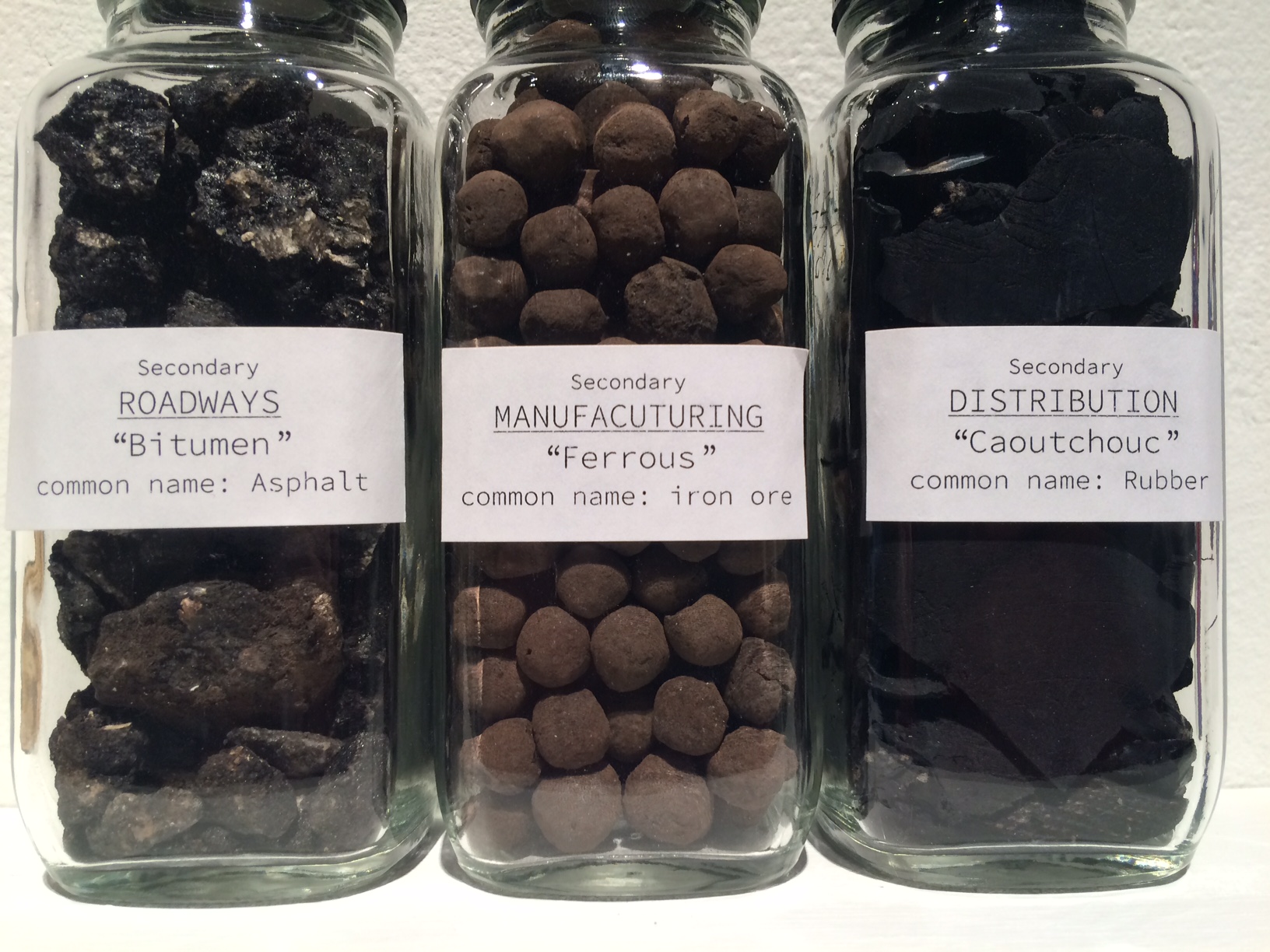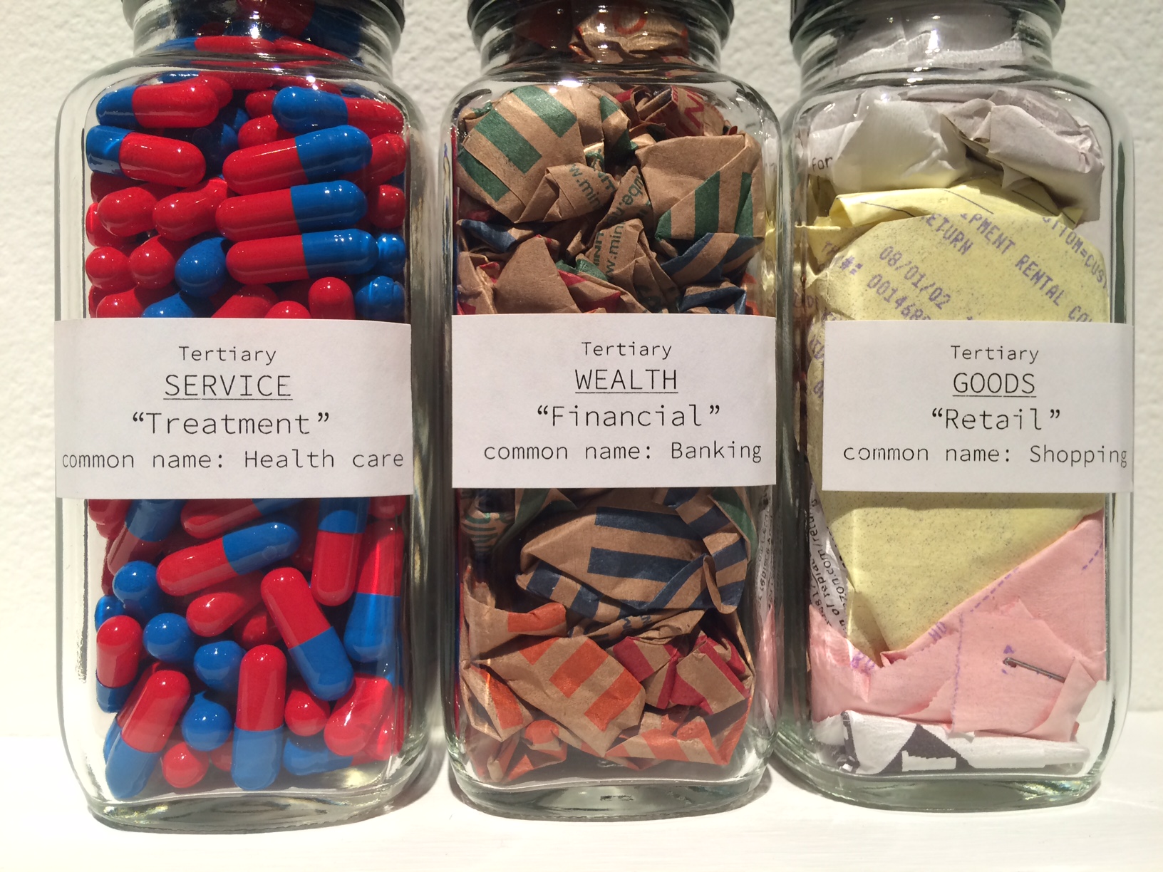 The collection of materials in these jars are sorted into the three sectors of commerce. Starting with the primary sector, these materials are raw and sourced directly from the earth. The second sector is the stage of transformation via manufacturing into durable goods. The third (tertiary) sector is direct services provided to the consumer.